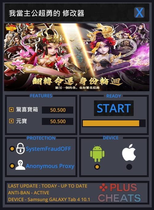我當主公超勇的修改器,可以繞過官方系統偵測,讓你成功修改出驚喜寶箱、元寶(請適度的修改,以免被發現作弊),支持最新版本的我當主公超勇的,在Android和iOS中輕鬆做修改。簡單實用,你的遊戲你做主!精小快速,永久免費,持續更新!