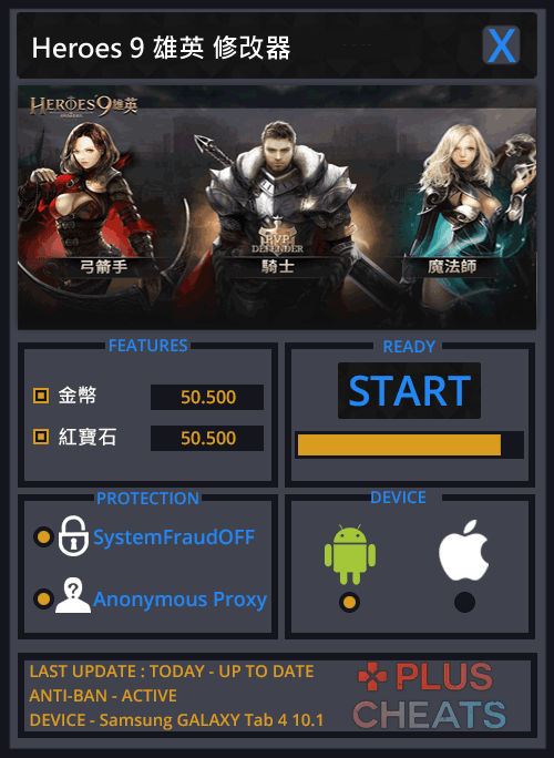 Heroes 9 雄英修改器,可以繞過官方系統偵測,讓你成功修改金幣、紅寶石(請適度的修改,以免被發現作弊),支持最新版本Heroes 9 雄英,在Android和iOS中輕鬆做修改。簡單實用,你的遊戲你做主!精小快速,永久免費,持續更新!
