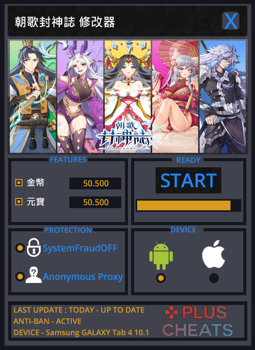 朝歌封神誌修改器,可以繞過官方系統偵測,讓你成功修改出金幣、元寶(請適度的修改,以免被發現作弊),支持最新版本的朝歌封神誌,在Android和iOS中輕鬆做修改。簡單實用,你的遊戲你做主!精小快速,永久免費,持續更新!