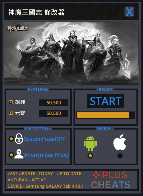 神魔三國志修改器,可以繞過官方系統偵測,讓你成功修改出銅錢、元寶(請適度的修改,以免被發現作弊),支持最新版本的神魔三國志,在Android和iOS中輕鬆做修改。簡單實用,你的遊戲你做主!精小快速,永久免費,持續更新!