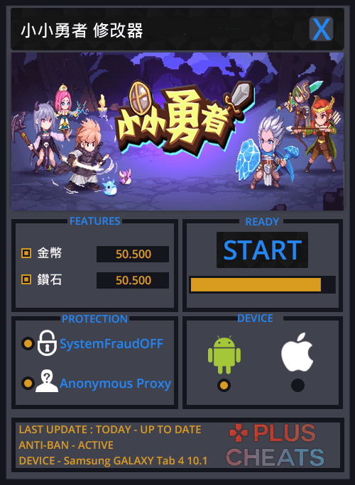 小小勇者修改器,可以繞過官方系統偵測,讓你成功修改出金幣、鑽石(請適度的修改,以免被發現作弊),支持最新版本的小小勇者,在Android和iOS中輕鬆做修改。簡單實用,你的遊戲你做主!精小快速,永久免費,持續更新!