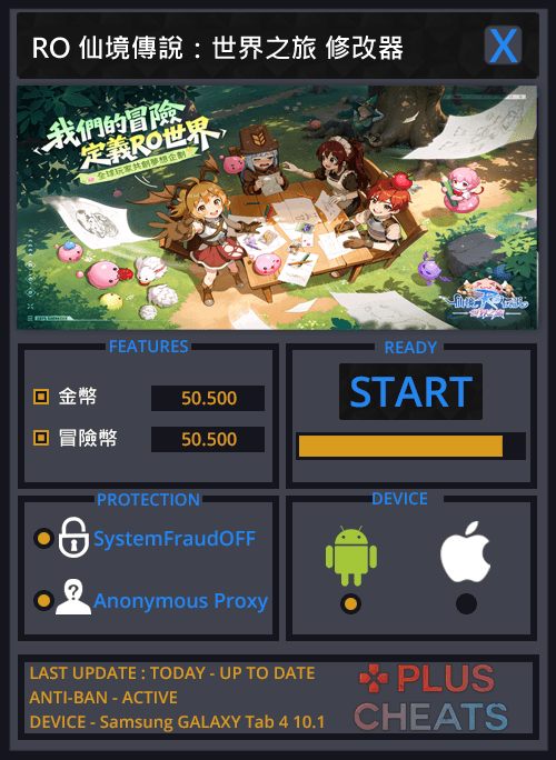 RO 仙境傳說:世界之旅修改器,可以繞過官方系統偵測,讓你成功修改出金幣、冒險幣(請適度的修改,以免被發現作弊),支持最新版本的RO 仙境傳說:世界之旅,在Android和iOS中輕鬆做修改。簡單實用,你的遊戲你做主!精小快速,永久免費,持續更新!