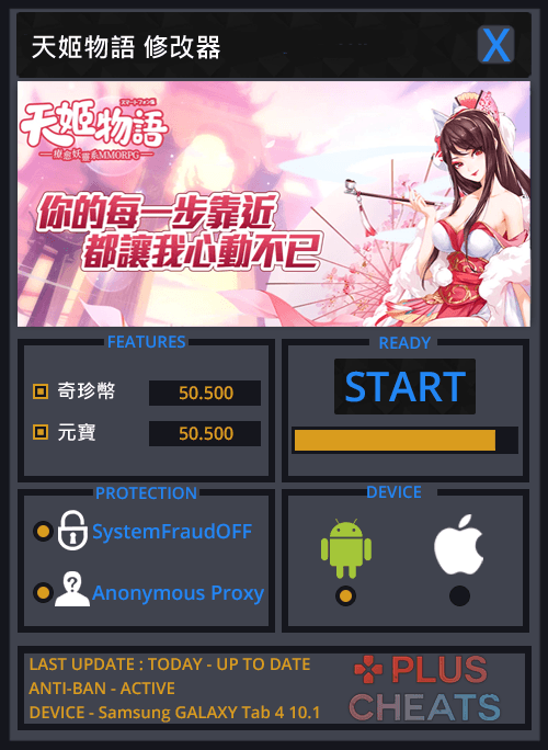 天姬物語修改器,可以繞過官方系統偵測,讓你成功修改出奇珍幣、元寶(請適度的修改,以免被發現作弊),支持最新版本的天姬物語,在Android和iOS中輕鬆做修改。簡單實用,你的遊戲你做主!精小快速,永久免費,持續更新!